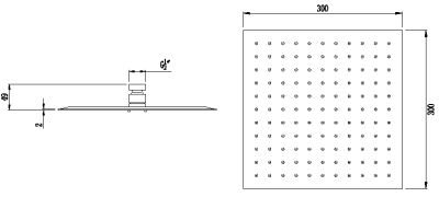 Nowoczesny model deszczownicy (SN-D30S) Slim o kwadratowym kształcie i długości boku 30 centymetrów. Idealnie nadaje się do montażu ściennego lub sufitowego. Poprzez zastosowany zawór kulkowy deszczownicę można ustawić pod wybranym kątem. Jest kompatybilna z ramieniem sufitowym lub ściennym, pasuje również do baterii podtynkowej ze słuchawką. Poprzez zastosowanie wysokiej jakości materiałów deszczownica odporna jest na matowienie i rdzewienie. Funkcja anti-calc chroni przed osadzaniem się kamienia i ułatwia czyszczenie dysz deszczownicy. Model wykonany jest z trwałej stali nierdzewnej i utrzymany w atrakcyjnej kolorystyce chromu z wykończeniem na wysoki połysk